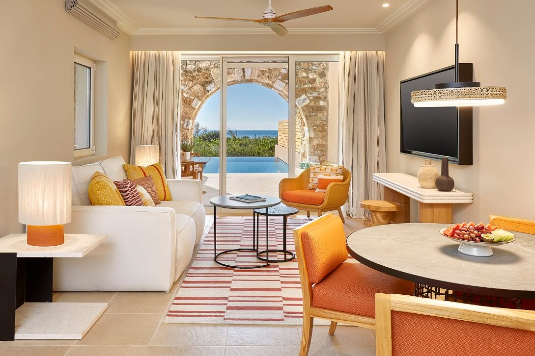 Όλα τα δωμάτια και οι οικογενειακές σουίτες έχουν ανακαινισμένους εσωτερικούς χώρους με στοιχεία που συνδυάζουν αρμονικά τη μεσσηνιακή κληρονομιά με μια σύγχρονη αισθητική, προσφέροντας μοναδική θέα στο Ιόνιο Πέλαγος και τη μεσσηνιακή φύση, ενώ πολλά από αυτά διαθέτουν και ιδιωτική πισίνα.