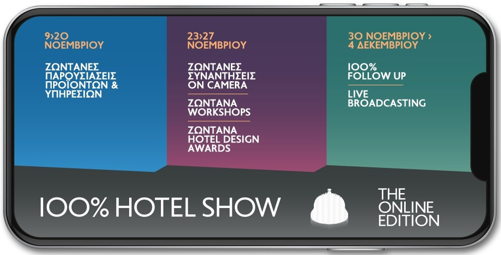 Με δεδομένο αυτό, αλλά και το ότι το κοινό δεν είναι ακόμη πλήρως εξοικειωμένο με τα Online Events, το 100% Hotel Show, παρουσιάζει ένα πολυεπίπεδο πρόγραμμα 30 ημερών, που έχει ως στόχο να διαμορφώσει μια πραγματικά διαδραστική πλατφόρμα επικοινωνίας μεταξύ Ξενοδόχων και Εταιρειών που θα καλύψει το κενό της αγοράς.