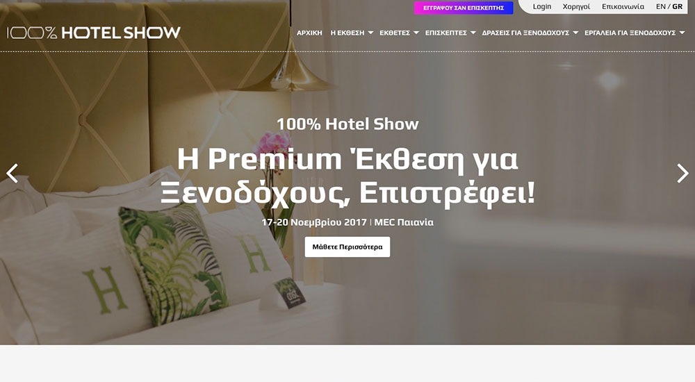 Στο νέο, εντυπωσιακό website του 100% Hotel Show, ο επισκέπτης μπορεί πλέον να δει περισσότερες πληροφορίες για τους εκθέτες, ενώ ο μοντέρνος και εύκολος μηχανισμός ραντεβού, επιτρέπει το ευκολότερο networking αναβαθμίζοντας την εκθεσιακή εμπειρία.