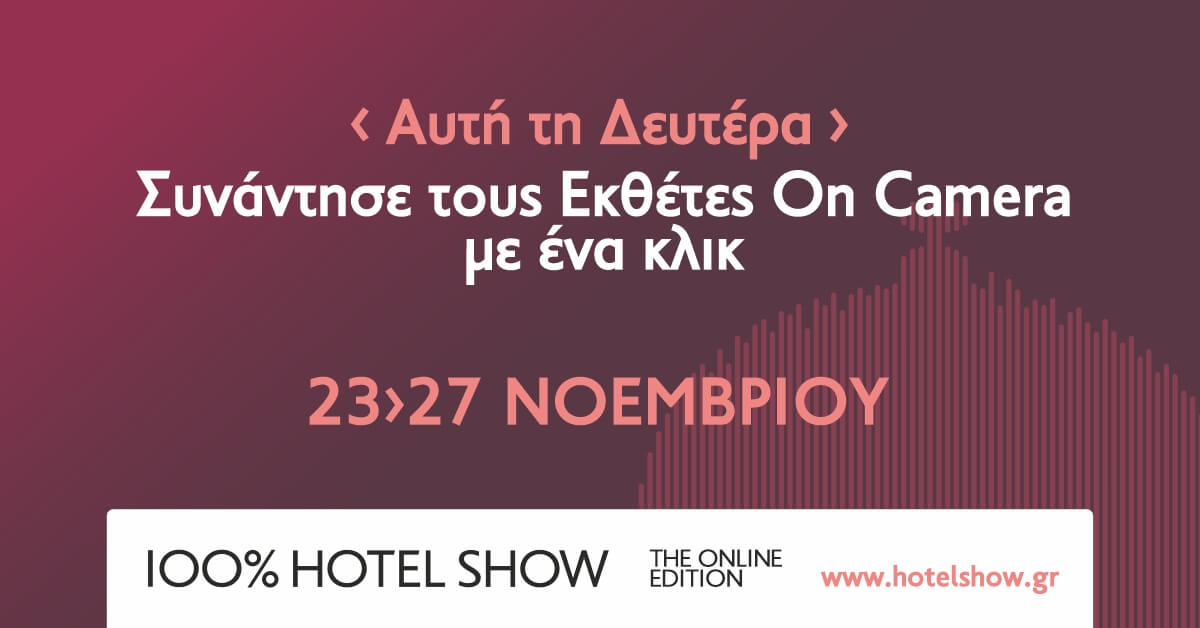Από τη Δευτέρα 23 μέχρι και την Παρασκευή 27 Νοεμβρίου, το 100% Hotel Show επανέρχεται με την πιο ολοκληρωμένη Online Διοργάνωση Έκθεσης στην Ελλάδα, με 200+ εκπροσώπους εταιρειών On Camera, 24 Designers που θα παρουσιάσουν ζωντανά τα έργα τους και 10 μεγάλα Online Ξενοδοχειακά Workshops.