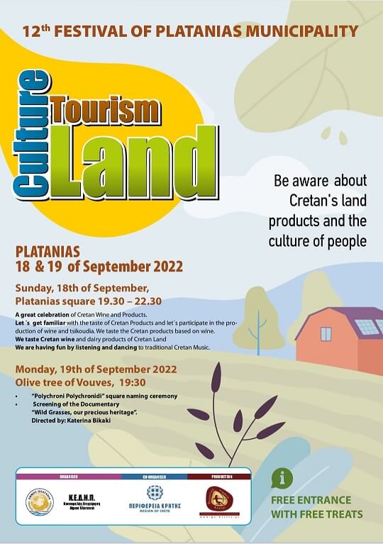 Ο Δήμος Πλατανιά Χανίων και η Κοινωφελής Επιχείρηση του Δήμου Πλατανιά, σε συνδιοργάνωση με την Περιφέρεια Κρήτης, διοργανώνουν για 12η συνεχόμενη χρονιά, το Φεστιβάλ: «Γη, Πολιτισμός, Τουρισμός».