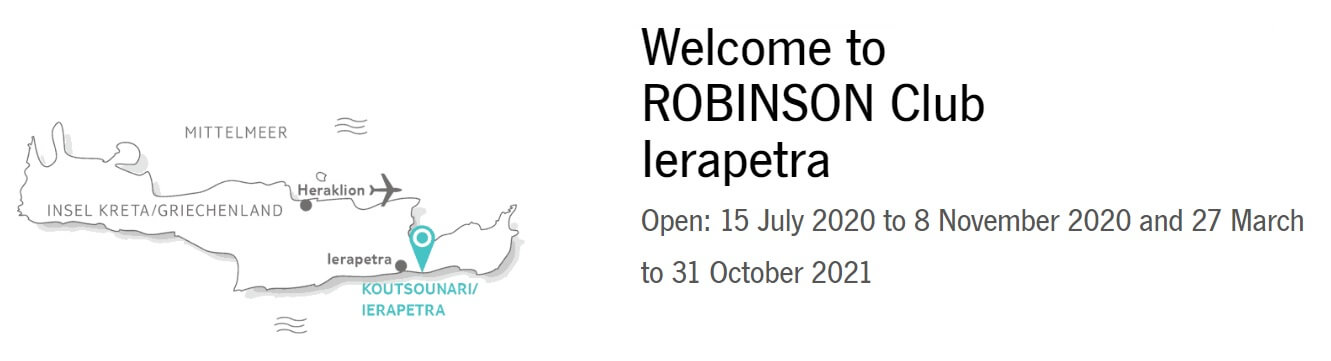Από τις 15 Ιουλίου έως τις 8 Νοεμβρίου θα λειτουργήσει το ολοκαίνουργιο 5άστερο ξενοδοχειακό συγκρότημα Robinson Club Ierapetra, σε παραθαλάσσια έκταση 142 στρεμμάτων στο Κουτσουνάρι Ιεράπετρας του νομού Λασιθίου.