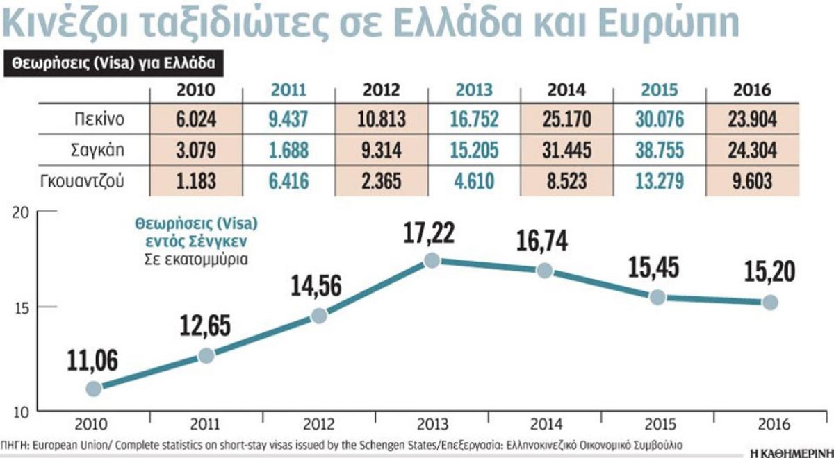 Φέτος αναμένονται στην Ελλάδα 170.000 Κινέζοι, σημειώνοντας αύξηση 10% - 15%, σε σχέση με πέρυσι, με αυξημένο ενδιαφέρον για τη Σαντορίνη, τη Μύκονο, την Αθήνα και τα Χανιά, σύμφωνα με στοιχεία του Ελληνοκινεζικού Οικονομικού Συμβουλίου, ενώ δημιουργούνται σταδιακά και οι προοπτικές προσέγγισης του 1 -