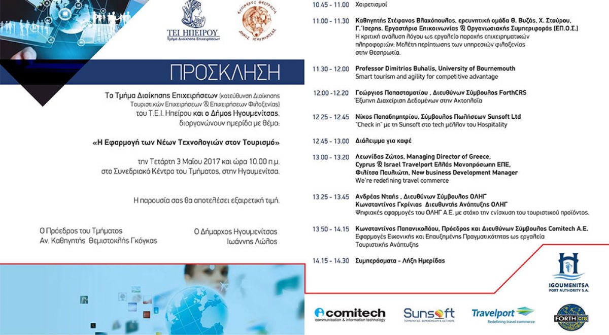 Με την εφαρμογή των Νέων Τεχνολογιών να αποτελεί νέα τάση και την απαραίτητη επένδυση στην τουριστική βιομηχανία, το ΤΕΙ Ηπείρου σε συνεργασία με το Δήμο Ηγουμενίτσας την Τετάρτη 3 Μαΐου 2017 και ώρα 10:00 π.μ. οργανώνει ημερίδα με θέμα: «Η εφαρμογή των Νέων Τεχνολογιών στον