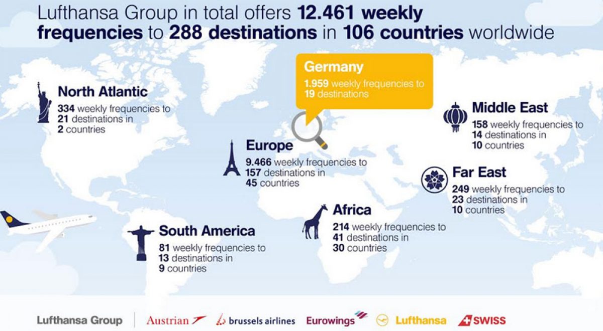 Οι αεροπορικές εταιρείες του oμίλου Lufthansa (Lufthansa, Swiss International Air Lines, Austrian Airlines, Brussels Airlines και Eurowings), θα προσφέρουν στο χειμερινό πρόγραμμα πτήσεων 12.461 πτήσεις κάθε βδομάδα, συνδέοντας 288 προορισμούς σε 106 χώρες. Το χειμερινό πρόγραμμα πτήσεων των αεροπορικών εταιρειών του Ομίλου θα ισχύει από την