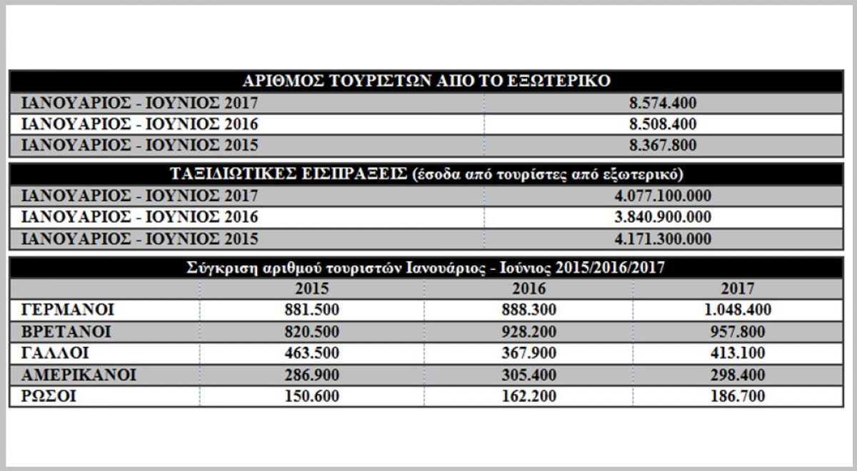 Σύμφωνα με τα οριστικά στοιχεία που ανακοίνωσε η Τράπεζα της Ελλάδας, την περίοδο Ιανουαρίου - Ιουνίου 2017, ο αριθμός των τουριστών από το εξωτερικό αυξήθηκε κατά 0,8% και διαμορφώθηκε στα 8.574.400, έναντι 8.508.400 τουριστών την αντίστοιχη περίοδο του 2016. Η ταξιδιωτική κίνηση μέσω αεροδρομίων αυξήθηκε κατά