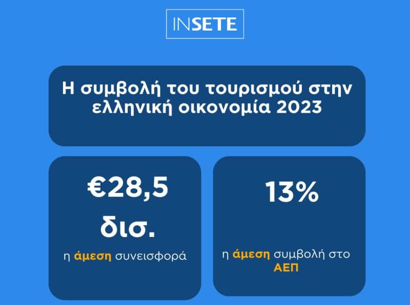 Τα στοιχεία προέρχονται από την τελευταία μελέτη του Ινστιτούτου του Συνδέσμου Ελληνικών Τουριστικών Επιχειρήσεων (ΙΝΣΕΤΕ) με θέμα «Η συμβολή του τουρισμού στην ελληνική οικονομία το 2023», σύμφωνα με την οποία αν συνυπολογιστεί και η έμμεση συνεισφορά του τομέα μέσω πολλαπλασιαστών, το αντίστοιχο ποσοστό ανεβαίνει περίπου στο 30%.