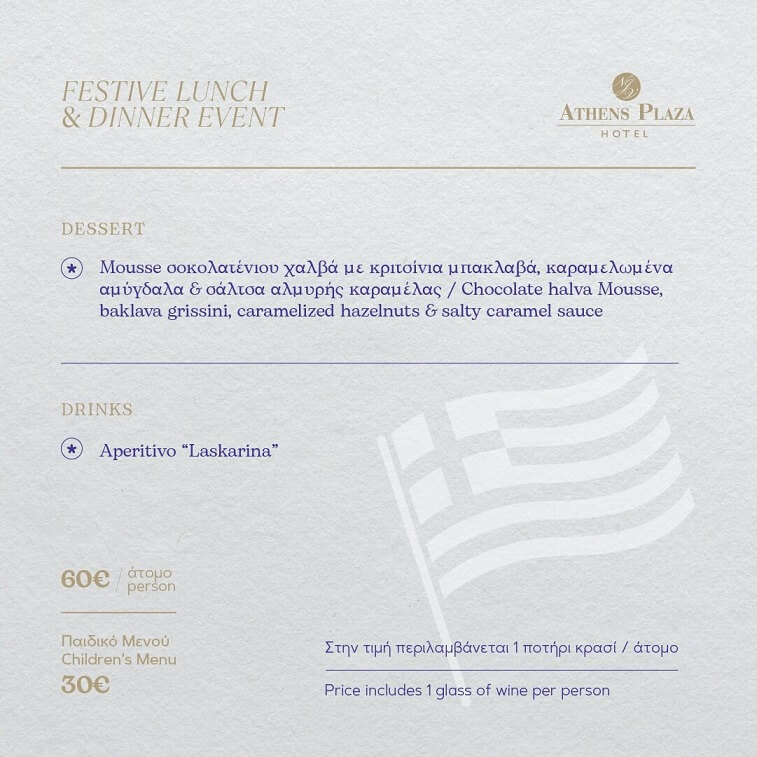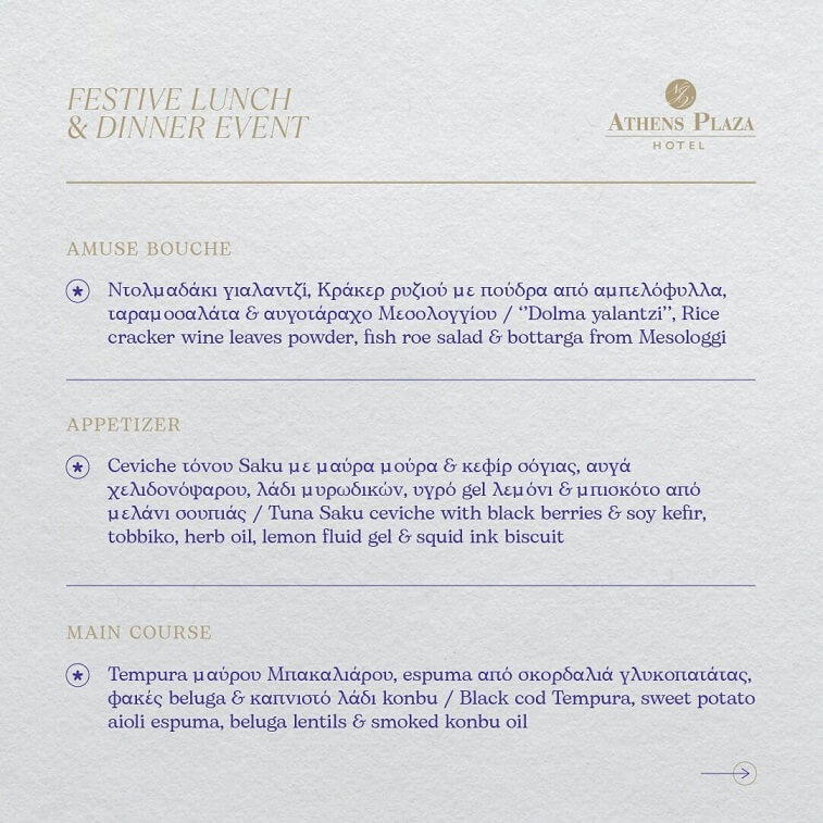 Απολαύστε ένα ξεχωριστό εορταστικό μενού τεσσάρων πιάτων, που συνδυάζει άψογα αγαπημένα παραδοσιακά πιάτα με τη σύγχρονη γαστρονομία στο Plaza Café και στο Explorer’s Bar Bistro.