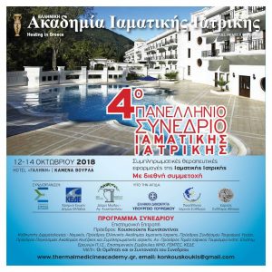 Το 4ο Πανελλήνιο Συνέδριο Ιαματικής Ιατρικής θα πραγματοποιηθεί στις 12 – 14 Οκτωβρίου 2018 στο ξενοδοχείο «Γαλήνη» στα Καμένα Βούρλα, με θέμα: «Συμπληρωματικές θεραπευτικές εφαρμογές της Ιαματικής Ιατρικής».