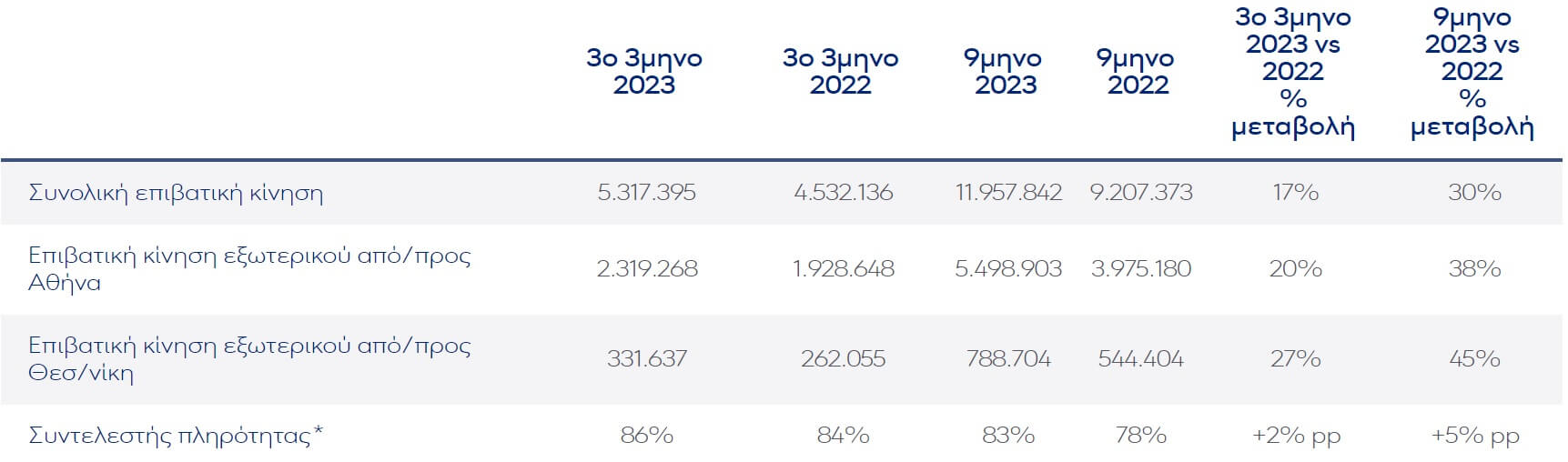 Σημαντική ήταν και η δυναμική της εταιρείας στο τρίτο τρίμηνο του χρόνου, σε σχέση με το αντίστοιχο του 2022 (έχοντας ήδη καταγράψει ισχυρές επιδόσεις) όπου μεταφέρθηκαν, 5,3 εκατ. επιβάτες με εξαιρετικά ισορροπημένη αύξηση, τόσο στην επιβατική κίνηση εσωτερικού κατά 17%, όσο και στην επιβατική κίνηση εξωτερικού κατά 18%.