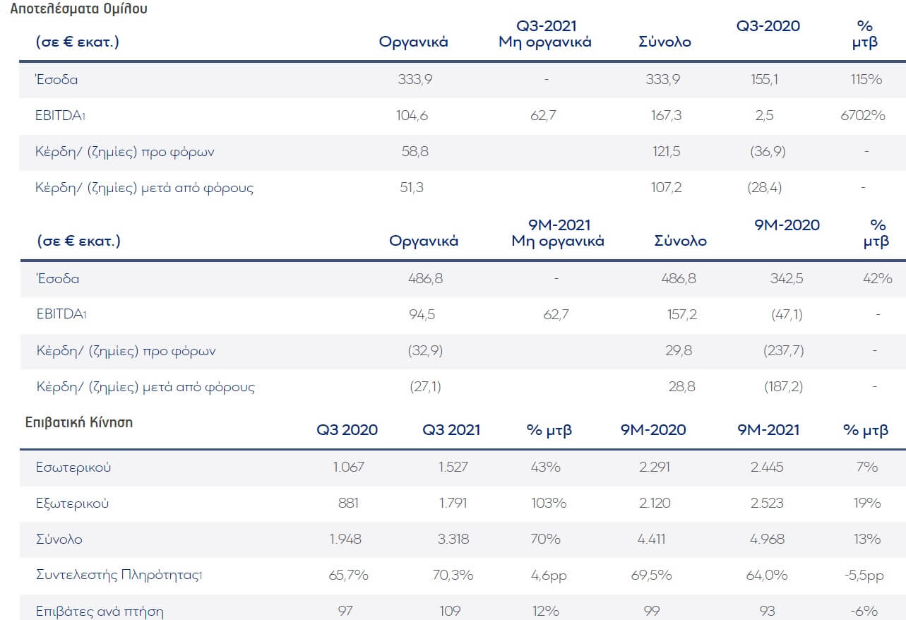 Τα ενοποιημένα έσοδα ανήλθαν σε 333,9 εκατ. ευρώ., αυξημένα κατά 115% συγκριτικά με το τρίτο τρίμηνο του 2020.