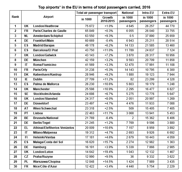 Πανευρωπαϊκά, με βάση τα στοιχεία της Eurostat για την επιβατική κίνηση των αεροδρομίων στην Ε.Ε. το 2016, το αεροδρόμιο με τη μεγαλύτερη επιβατική κίνηση ήταν το Heathrow του Λονδίνου με 75.670.000 επιβάτες και ακολούθησε το Charles de Gaulle του Παρισιού με 65.800.000 επιβάτες και το Schiphol του Άμστερνταμ με 63.500.000 επιβάτες.