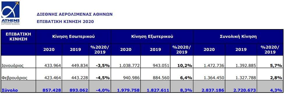 Συνολικά, κατά τους πρώτους δύο μήνες του 2020, η κίνηση του αεροδρομίου της Αθήνας έφθασε τα 2.837.186 επιβάτες, σημειώνοντας αύξηση κατά 4,3%, σε σχέση με το ίδιο διάστημα του 2019 (2.720.673 επιβάτες).
