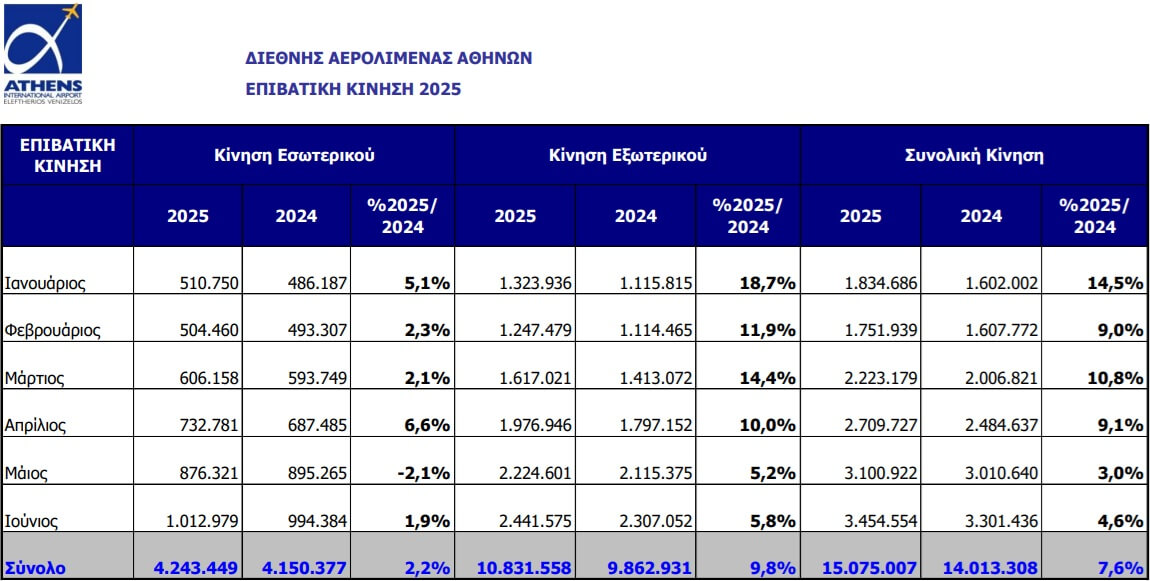 Η επιβατική κίνηση του αεροδρομίου της Αθήνας κατά τη διάρκεια του φετινού Ιουνίου ανήλθε στα 3.454.554, αυξημένη κατά 4,6% σε σύγκριση με το 2024.