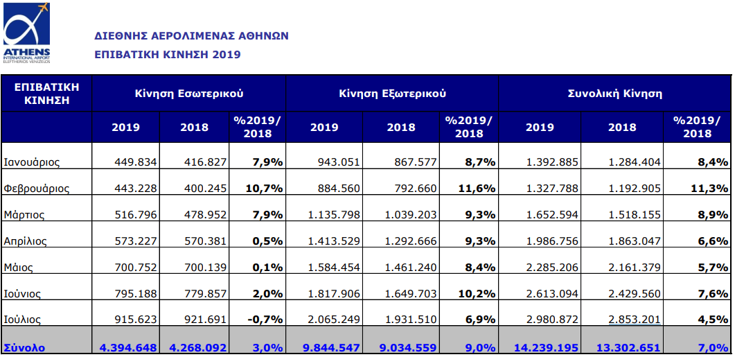 Την περίοδο Ιανουαρίου – Ιουλίου 2019, η κίνηση του αεροδρομίου της Αθήνας έφθασε τα 14.239.195 επιβάτες, σημειώνοντας άνοδο της τάξης του 7% σε σχέση με το ίδιο διάστημα του 2018 (13.302.651 επιβάτες).