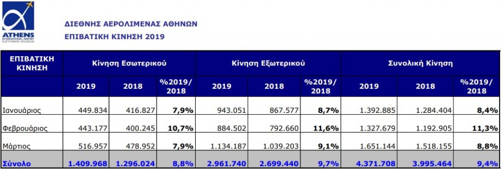 Τους πρώτους τρεις μήνες του 2019, η κίνηση του αεροδρομίου της Αθήνας έφθασε τα 4.371.708 επιβάτες, σημειώνοντας αύξηση 9,4% σε σχέση με το ίδιο διάστημα του 2018 (3.995.464 επιβάτες).