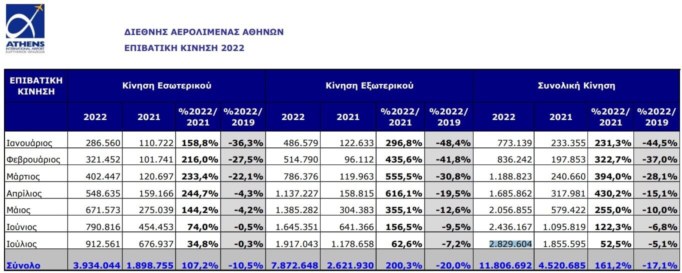 Το πρώτο επτάμηνο (Ιανουάριος – Ιούλιος) του 2022, η επιβατική κίνηση του αεροδρομίου της Αθήνας έφτασε τα 11.806.692 και παρέμεινε μειωμένη κατά 17,1% σε σύγκριση με το ίδιο διάστημα του 2019.
