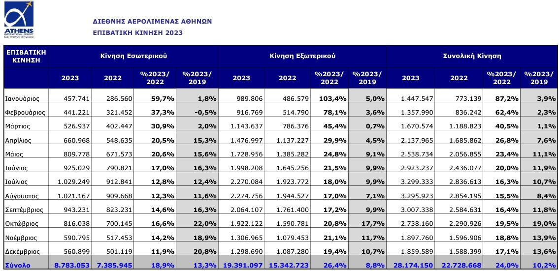 Η επιβατική κίνηση του αεροδρομίου της Αθήνας το 2023 ανήλθε σε 28.174.150, αυξημένη κατά 24% σε σύγκριση με το 2022, αλλά και κατά 10,2% σε σύγκριση με το 2019.