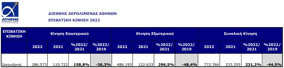 Να σημειωθεί ότι σε σύγκριση με τον Ιανουάριο του 2021, όταν όμως η χώρα βρισκόταν σε lockdown, η επιβατική κίνηση του Ιανουαρίου κατέγραψε αύξηση 231,2%.