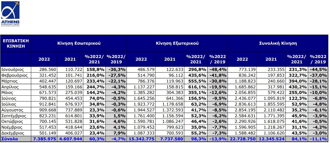Ειδικότερα, σε σύγκριση με το 2021, οι επιβάτες εσωτερικού αυξήθηκαν κατά 60,3% και οι διεθνείς επιβάτες κατά 98,3%, αλλά υστέρησαν σε σχέση με το 2019, κατά 4,7% και 13,9% αντίστοιχα.