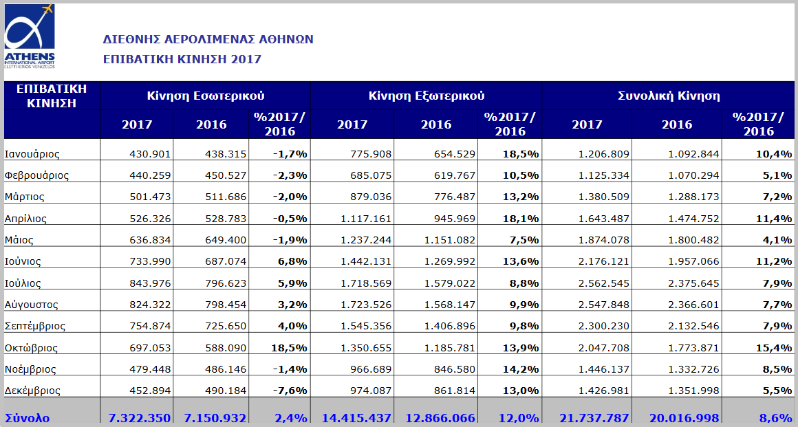 Το 2017, το αεροδρόμιο της Αθήνας κατέγραψε την καλύτερη ιστορική επίδοσή του από πλευράς επιβατικής κίνησης με 21.737.787 επιβάτες, ξεπερνώντας κατά περίπου 1.700.000 επιβάτες (αύξηση 8,6%) την κίνηση του 2016 (20.016.998 επιβάτες).