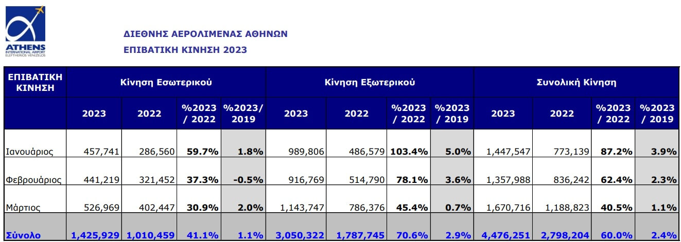 Η επιβατική κίνηση του αεροδρομίου της Αθήνας κατά τη διάρκεια του φετινού Μαρτίου ανήλθε σε 1.670.716, αυξημένη κατά 40,5% σε σύγκριση το Μάρτιο του 2022 (περίοδο κατά την οποία εξακολουθούσαν οι επιπτώσεις της πανδημίας COVID-19 στο αεροπορικό ταξίδι), αλλά και αυξημένη κατά 1,1% σε σχέση με τα προ-COVID-19 επίπεδα του 2019.