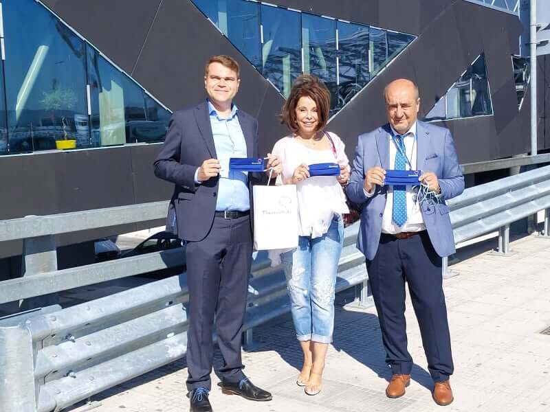 Η Αντιπεριφερειάρχης της Μητροπολιτικής Ενότητας Θεσσαλονίκης και πρόεδρος του Οργανισμού Τουρισμού Θεσσαλονίκης, Βούλα Πατουλίδου, συναντήθηκε χθες το πρωί με τη διοίκηση της Fraport και παρέδωσε στο γενικό διευθυντή επιχειρησιακής λειτουργίας Ηλία Μαραγκάκη και τον Αερολιμενάρχη Γιάννη Βογιατζή τις μάσκες του Οργανισμού Τουρισμού Θεσσαλονίκης που θα φορούν οι εργαζόμενοι του αεροδρομίου με το χαρακτηριστικό σήμα της Θεσσαλονίκης.