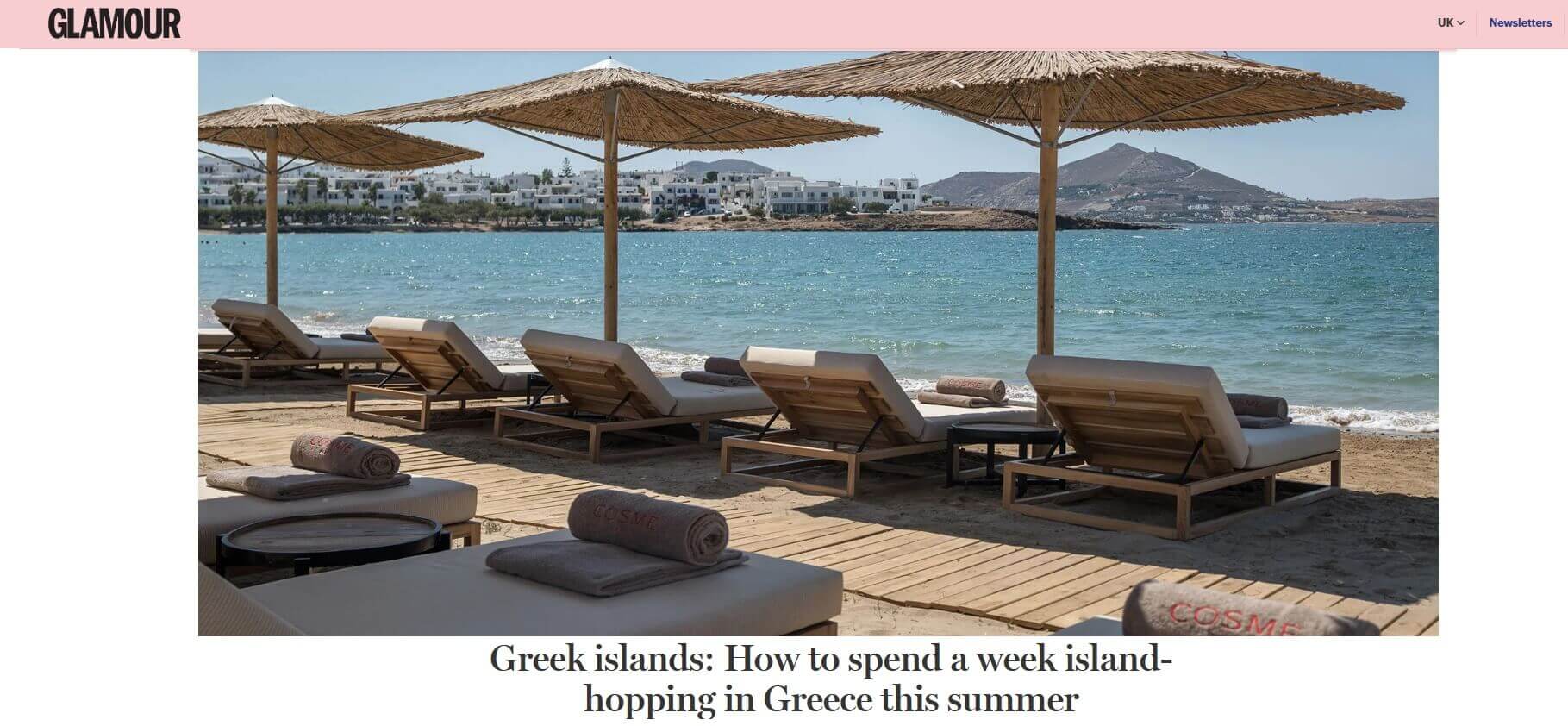 Την περιήγησή της στην Πάρο, τη Μήλο και τη Σαντορίνη περιγράφει με γλαφυρό τρόπο η Ali Pantony συντάκτρια του βρετανικού περιοδικού μόδας Glamour Magazine.