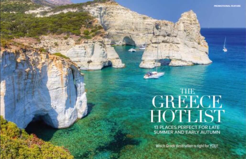 Εντυπωσιακό δωδεκασέλιδο αφιέρωμα σε δεκατρείς ελληνικούς προορισμούς, φιλοξενήθηκε στο τεύχος Σεπτεμβρίου/Οκτωβρίου του Wanderlust, ενός από τα δημοφιλέστερα ταξιδιωτικά περιοδικά στη Βρετανία. Συγκεκριμένα Πήλιο, παραθαλάσσια Ήπειρος, Χαλκιδική, Κεφαλονιά, Κρήτη, Λειψοί, Ζάκυνθος, Ρόδος, Λήμνος, Κως, Σκιάθος, Κουφονήσια και Μήλος, προβλήθηκαν ως ιδανικοί προορισμοί για κρατήσεις στο τέλος του καλοκαιριού και αρχές φθινοπώρου.