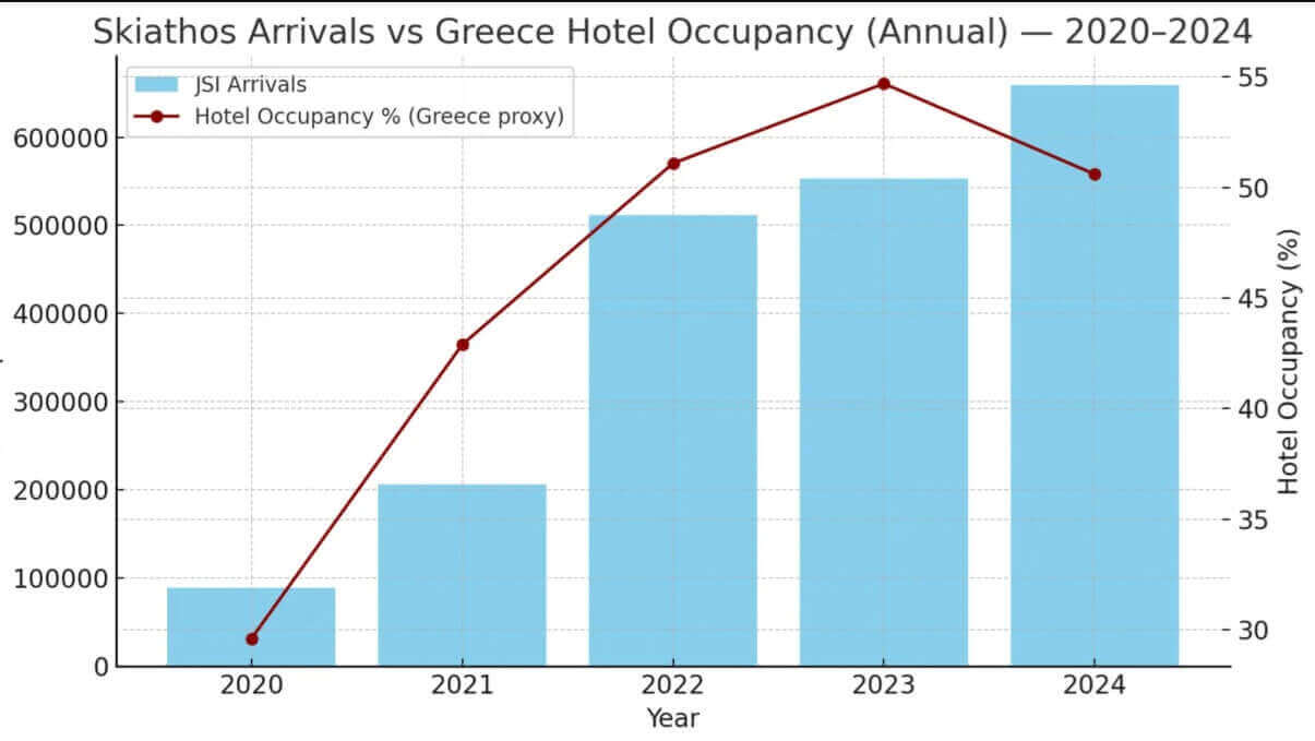 Το πρώτο διάγραμμα που κατασκευάστηκε με ΑΙ δείχνει κάτι που ίσως να μην γίνεται αντιληπτό με «γυμνό μάτι» παρατηρώντας τις ολοένα αυξανόμενες αφίξεις στο νησί: Παρότι οι αφίξεις αυξάνονται, οι παραμονές σε ξενοδοχεία δεν αυξάνουν. Οι επισκέπτες διαλέγουν άλλες μορφές διαμονής.