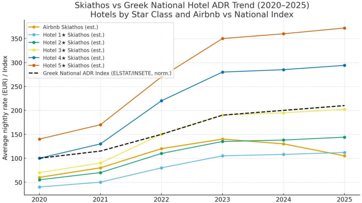 Το δεύτερο συγκρίνει τις τιμές των ξενοδοχείων ανά κατηγορία με τον πανελλήνιο μέσο όρο, αλλά και με τα καταλύματα βραχυχρόνιας μίσθωσης στη Σκιάθο.