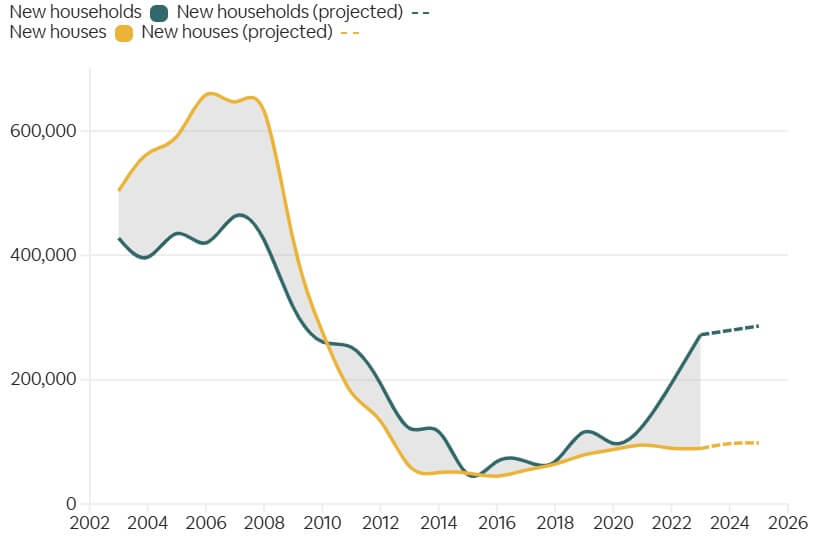 Πηγή: Εθνική Στατιστική Υπηρεσία και Υπουργείο Στέγασης, (1) Οι νέες μονάδες κατοικίας περιλαμβάνουν τόσο ολοκληρωμένα σπίτια ελεύθερης αγοράς όσο και τελικές πιστοποιήσεις προστατευμένων κατοικιών, (2) Για την πρόβλεψη στέγασης για τα επόμενα δύο χρόνια, εμφανίζονται οι μονάδες κατοικίας που ξεκίνησαν δύο χρόνια νωρίτερα.