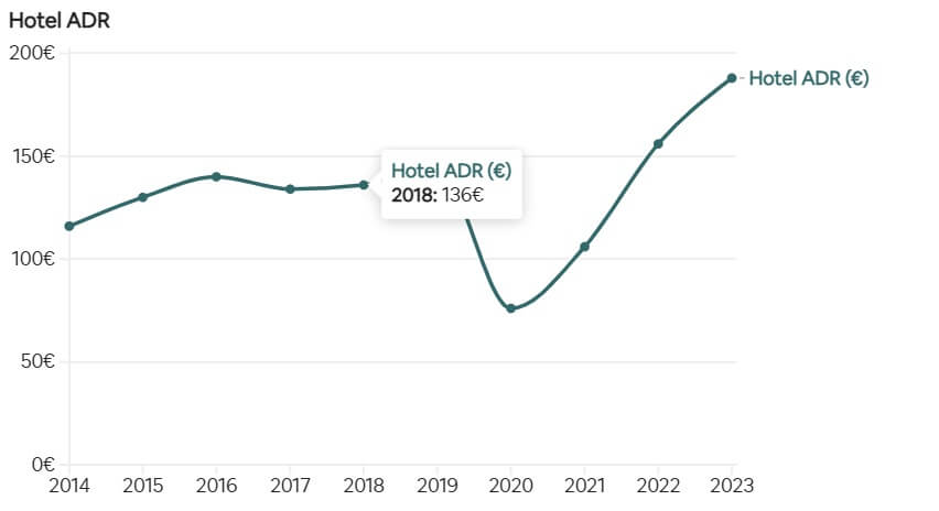 Πηγή: Πόρταλ δεδομένων Δήμου Βαρκελώνης: Μέση τιμή δωματίου ανά κράτηση (ADR; €) τον Οκτώβριο του 2023, 188,8€ σε σύγκριση με 116€ τον Οκτώβριο του 2014.