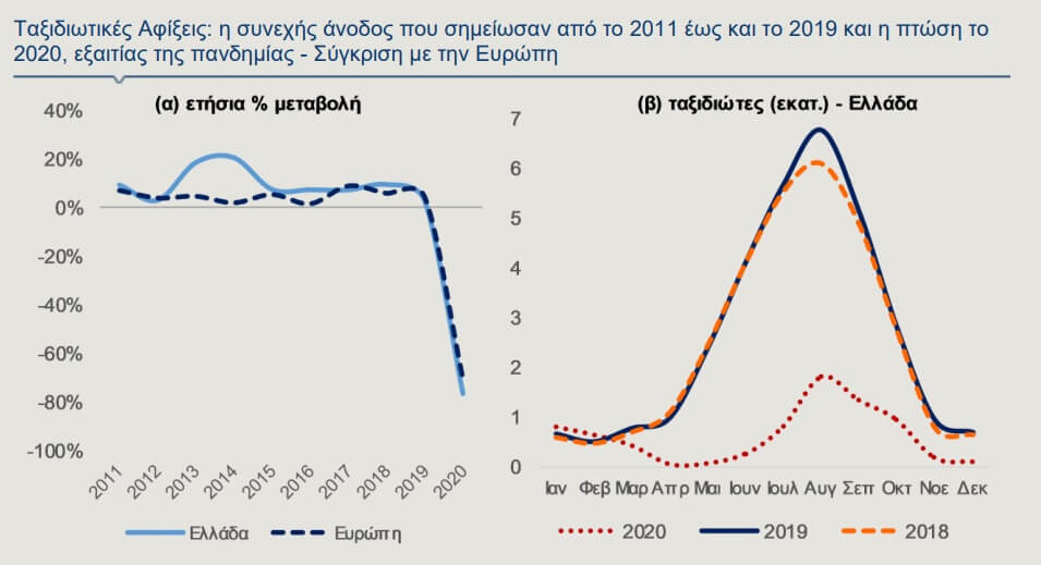 Επιπρόσθετα, παρά το γεγονός ότι η άνοδος των τουριστικών αφίξεων στην Ελλάδα, τα προηγούμενα χρόνια, ήταν, κατά μέσο όρο, εντονότερη σε σύγκριση με την Ευρώπη, η μείωση των αφίξεων στις ευρωπαϊκές χώρες, συνολικά το 2020, ήταν ηπιότερη (-70% σε σχέση με το 2019).