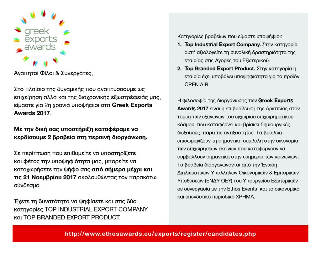 Στο πλαίσιο της δυναμικής και της εξωστρέφειας που αναπτύσσει τα τελευταία χρόνια η ALUMINCO, είναι για 2η χρονιά υποψήφια στα Greek Exports Awards 2017.