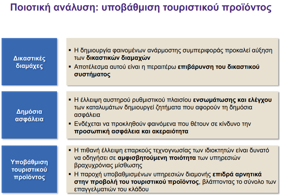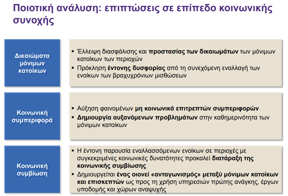 – Tην ύπαρξη του φαινόμενου «εκτοπισμού» ακινήτων από τις μακροχρόνιες στις βραχυχρόνιες μισθώσεις. Παρατηρείται ότι το πλήθος των ακινήτων βραχυχρόνιας μίσθωσης αναπτύσσεται με μεγαλύτερο ρυθμό από αυτόν των ακινήτων μακροχρόνιας μίσθωσης. Κατά αυτόν τον τρόπο προκαλείται ανισορροπία στην ανάπτυξη του τουριστικού και του υπόλοιπου οικιστικού περιβάλλοντος με αύξηση των τιμών ενοικίασης και επιβάρυνση των οικονομικά ασθενέστερων.