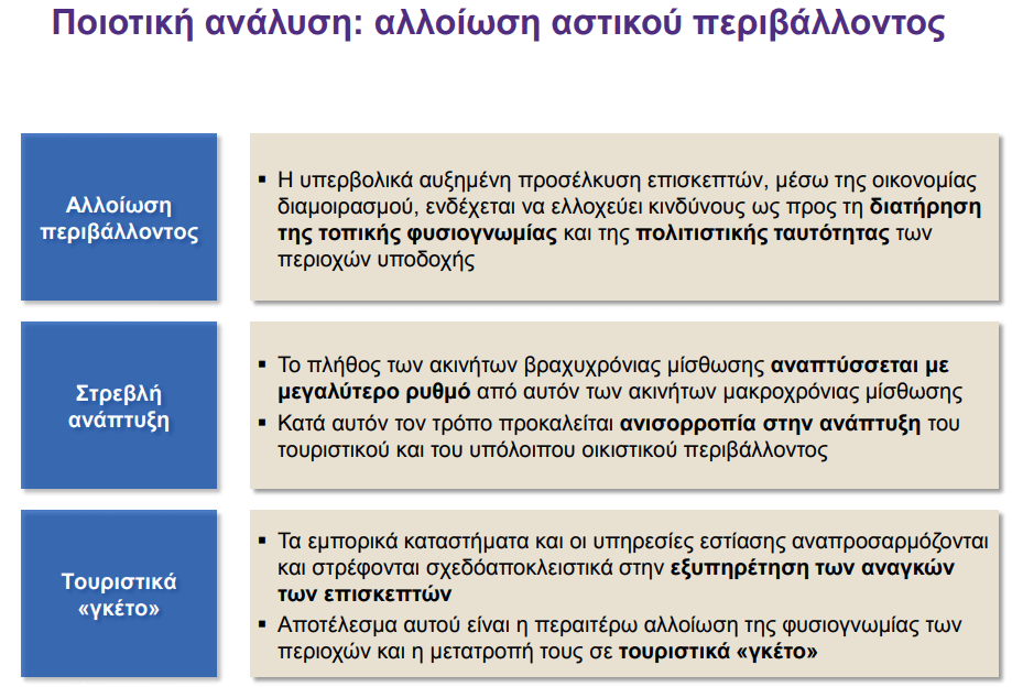 – Αρνητικές επιδράσεις σε επίπεδο κοινωνικής συνοχής με αλλοίωση αστικού περιβάλλοντος, με στρεβλή ανάπτυξη. Τα εμπορικά καταστήματα και οι υπηρεσίες εστίασης αναπροσαρμόζονται και στρέφονται σχεδόν αποκλειστικά στην εξυπηρέτηση των αναγκών των επισκεπτών. Αποτέλεσμα αυτού είναι η περαιτέρω αλλοίωση της φυσιογνωμίας των περιοχών και η μετατροπή τους σε τουριστικά «γκέτο». Τέλος διαπιστώνεται αύξηση δικαστικών διαμαχών, με συνδυαστική πρόκληση ζητημάτων δημόσιας ασφάλειας, Ως εκ τούτου ελλοχεύει άμεσα ο κίνδυνος γενικότερης υποβάθμισης του τουριστικού προϊόντος της χώρας.