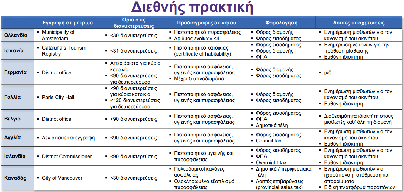 Αναλυτικά διεθνώς καταγράφεται: 1. Η εγγραφή του ακινήτου σε σχετικό μητρώο και τήρηση τεχνικών και λειτουργικών προδιαγραφών, 2. Ο προσδιορισμός ορίου στις ημέρες μίσθωσης και καθορισμός μέγιστου αριθμού ακινήτων ανά ιδιοκτήτη προς διάθεση, 3. Η εξασφάλιση της προστασίας των κατοίκων με πρόβλεψη κανόνων / οδηγιών κοινωνικής συμπεριφοράς. 4. Η φορολόγηση με πρόβλεψη ισοδύναμης φορολογικής επιβάρυνσης, 5. Η θέσπιση σχετικού νομοθετικού πλαισίου με σαφείς κανόνες λειτουργίας, 6. Η ύπαρξη μηχανισμών παρακολούθησης της εφαρμογής των κανονιστικών ρυθμίσεων που τίθενται, 7. Η συνεργασία ρυθμιστικών αρχών με διαμεσολαβητές υπηρεσιών οικονομίας διαμοιρασμού με σύναψη πρωτοκόλλων συνεργασίας για την τεχνική σύνδεση των συστημάτων και την ανταλλαγή δεδομένων.