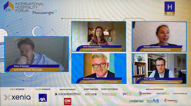 Στην πρώτη θεματική συζήτηση με τίτλο: «Στρατηγικές λειτουργίας στη μετά Covid-19 εποχή» με συντονιστή τον Peter O’ Connor, συμμετείχαν τέσσερις διακεκριμένοι ομιλητές: ο Franck Arnold, Regional VP & Managing Director, The Savoy London, η Άννα Αθανασοπούλου, Επικεφαλής Τουρισμού, Κλωστοϋφαντουργικών Ειδών και Δημιουργικών Βιομηχανιών της Ευρωπαϊκής Επιτροπής, η Margaux Constantin, Αναπληρώτρια Διευθύντρια στα γραφεία της McKinsey στο Ντουμπάι και ο Δρ. Willy Legrand, καθηγητής Διοίκησης Φιλοξενίας στο Διεθνές Πανεπιστήμιο Εφαρμοσμένων Επιστημών IUBH στο Bad Honnef της Γερμανίας.