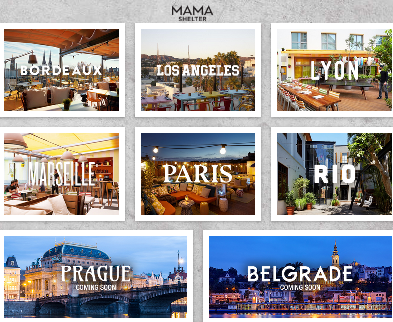 Μέχρι τώρα η Mama Shelter έχει παρουσία σε τρεις χώρες και έξι πόλεις (Γαλλία: Μπορντό, Λυόν, Μασσαλία και Παρίσι, Βραζιλία: Ρίο και ΗΠΑ: Λος Άντζελες) και θα λειτουργήσει νέα ξενοδοχεία σε Πράγα και Βελιγράδι.