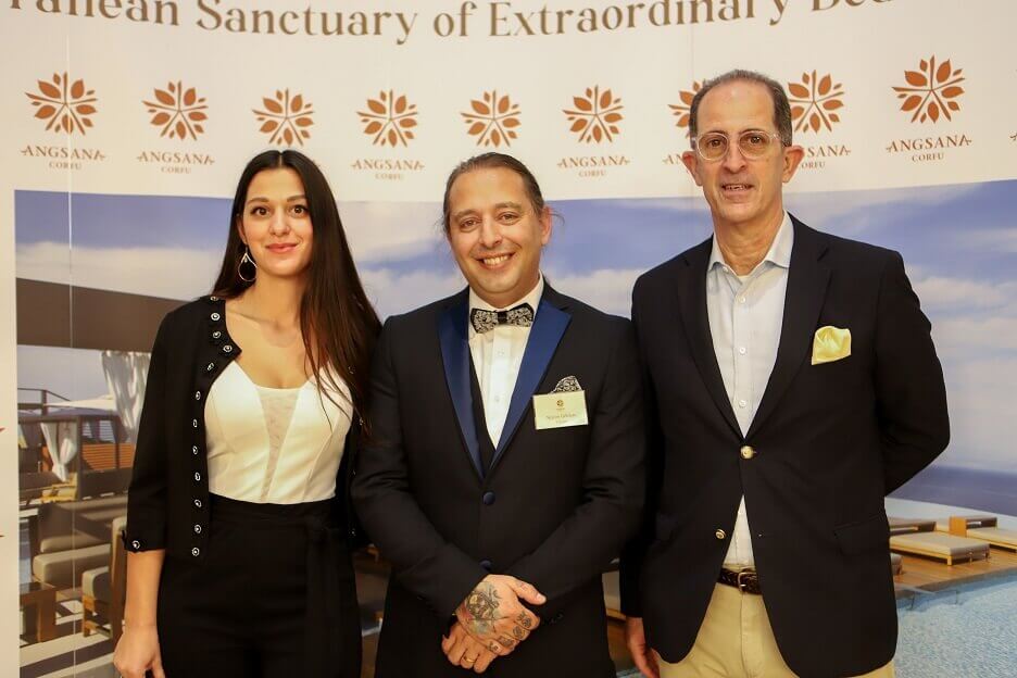 Στη φωτογραφία από δεξιά: Μιχάλης Μεταξάς, Γενικός Διευθυντής Angsana Corfu Resort & Spa, Σπύρος Γελέκας, ζωγράφος, Χριστιάνα – Βερόνικα Καποδίστρια, P.A. του κ. Μεταξά και συγγραφέας.