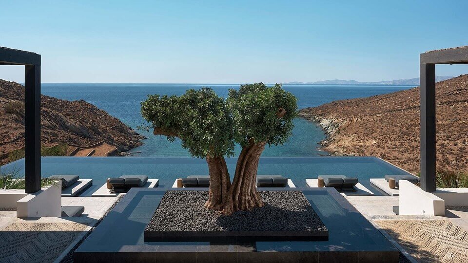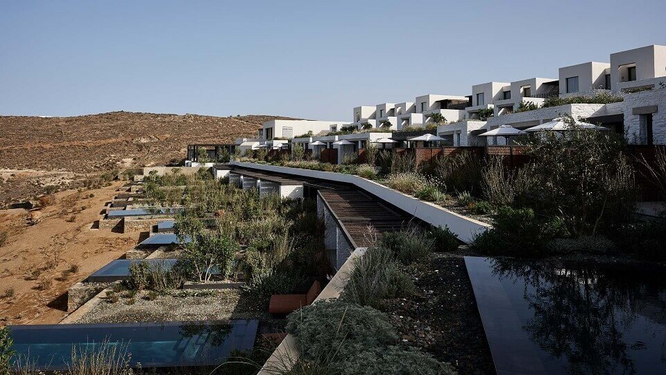 Σκαρφαλωμένο σε έναν λόφο με θέα στην παραλία Βουρνή, το ξενοδοχείο φέρνει κοντά την παράδοση με τη σύγχρονη αισθητική.