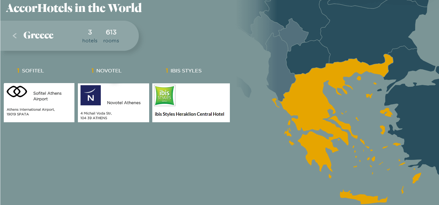 Ο όμιλος Accor, δραστηριοποιείται στην Ελλάδα εδώ και 30 χρόνια, αρχικά μέσω του «Novotel Athens», στη συνέχεια με το «Sofitel» στο αεροδρόμιο της Αθήνας και από το 2017 με το «ibis Styles Heraklion Central Hotel» (φωτογραφία) στο Ηράκλειο της Κρήτης.