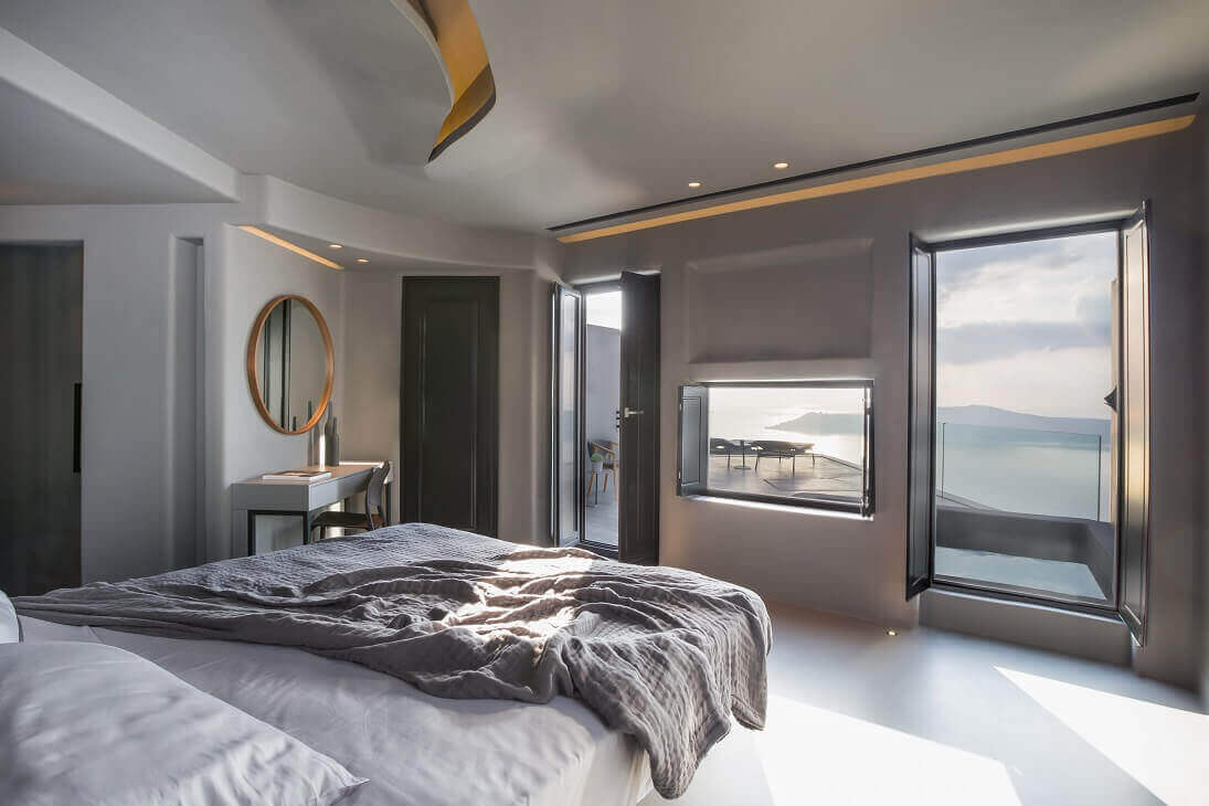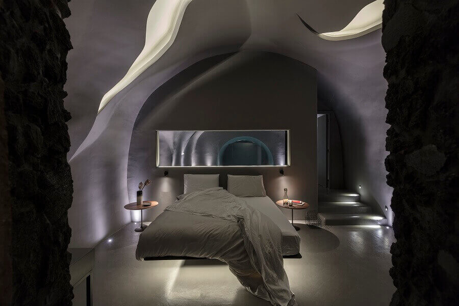 Και είναι αυτό το οπτικο-διακοσμητικό εφέ μαζί με τα αυτοχειριζόμενα ακουστικά συστήματα Sonos που τελικά προσδίδουν μια αξεπέραστη δραματικότητα στα κατά τα άλλα λιτά και μοντέρνα εσωτερικά του Kivotos Santorini με τα σαν αιωρούμενα κρεβάτια. Όσο για το άλλο δυνατό asset του ξενοδοχείου, αυτό σε περιμένει εκεί έξω και ακούει σε όλα τα ονόματα του προσωπικού του. Που είναι έτοιμο να ικανοποιήσει κάθε σου επιθυμία. Ακόμα κι αν αυτή είναι να μετατρέψεις το δωμάτιό σου σε ιδιωτικό Spa.