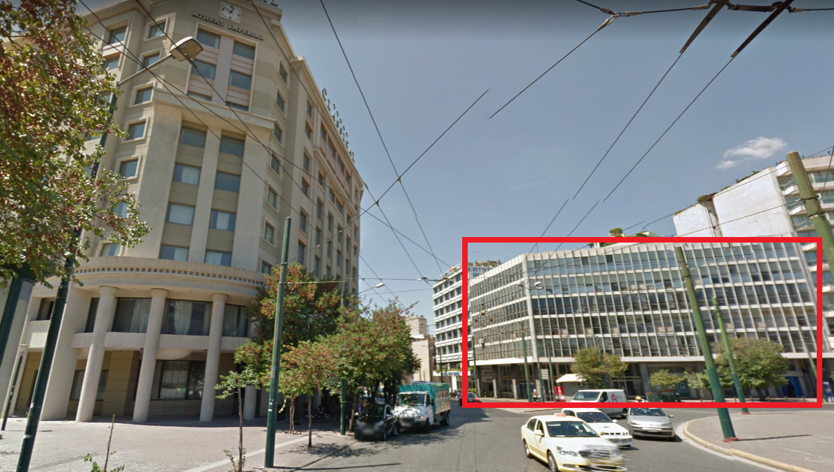 Αριστερά διακρίνεται το ξενοδοχείο Αthens Imperial, που από το Δεκέμβριο του 2016 λειτουργεί ως Wyndham Grand Athens και δεξιά σε κόκκινο πλαίσιο το κτήριο που θα μετατραπεί στο Wyndham Grand Residences & Suites