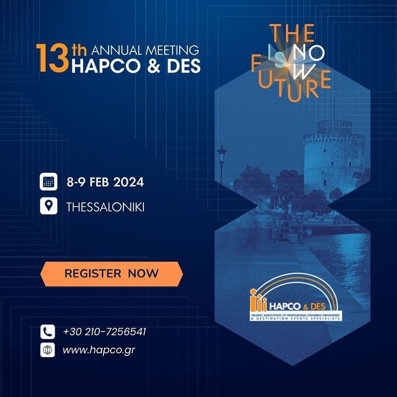 Άνοιξαν οι εγγραφές για το 13ο Πανελλήνιο Συνέδριο HAPCO & DES (Hellenic Association of Professional Congress Organizers & Destination Events Specialists – Σύνδεσμος Ελλήνων Επαγγελματιών Εκδηλώσεων & Οργανωτών Συνεδρίων), με τίτλο «The Future is Now!», που θα πραγματοποιηθεί 8 & 9 Φεβρουαρίου 2024, στο Μέγαρο Μουσικής Θεσσαλονίκης.