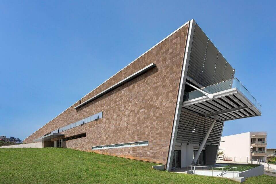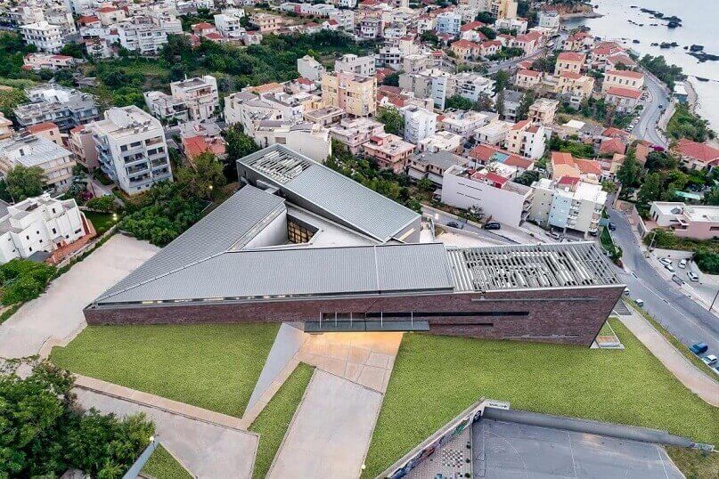 Πρόκειται για συμβολική αναφορά στα τεκμήρια του πολιτισμού που βρίσκονται κάτω από την επιφάνειά της, αλλά συγχρόνως και μία βιοκλιματική επιλογή με την καλύτερη δυνατή προσαρμογή του κτίσματος στο έντονα επικλινές οικόπεδο.