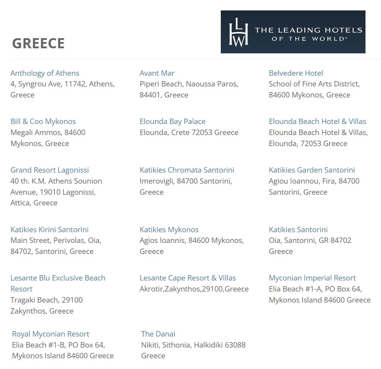 Ακολουθεί η λίστα με τα 17 ξενοδοχεία – μέλη των «Τhe Leading Hotels of the World» στην Ελλάδα.