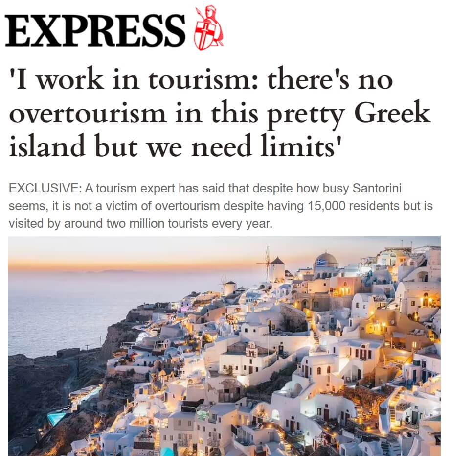 «Δεν υπάρχει υπερτουρισμός στη Σαντορίνη, αλλά χρειαζόμαστε όρια», ανέφερε απαντώντας σε ερωτήσεις της δημοσιογράφου Alice Scarsi της εφημερίδας express.co.uk, ο πρόεδρος της Ένωσης ξενοδόχων Σαντορίνης Αντώνης Παγώνης.