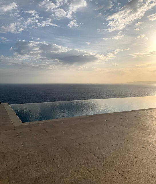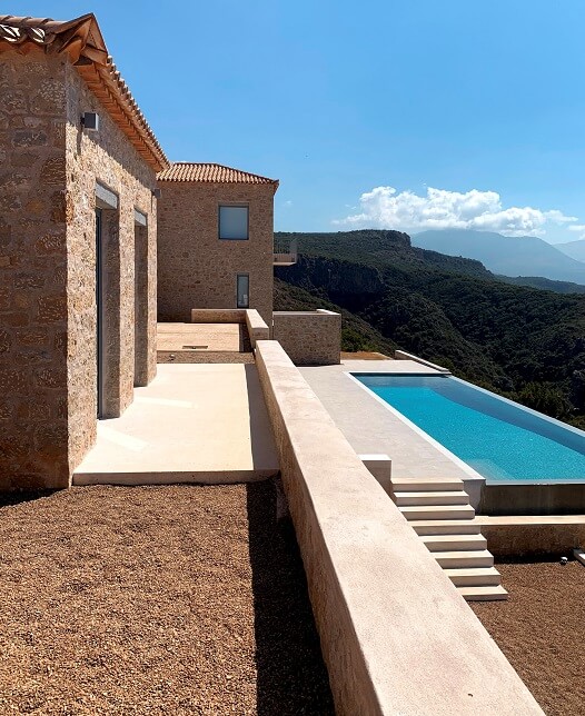 Από τις επιβλητικές βεράντες καθώς και από την infinity pool, οι φιλοξενούμενοι μπορούν να απολαύσουν την εκπληκτική πανοραμική θέα, αλλά και τo μοναδικό ηλιοβασίλεμα της Μεσσηνιακής Μάνης.